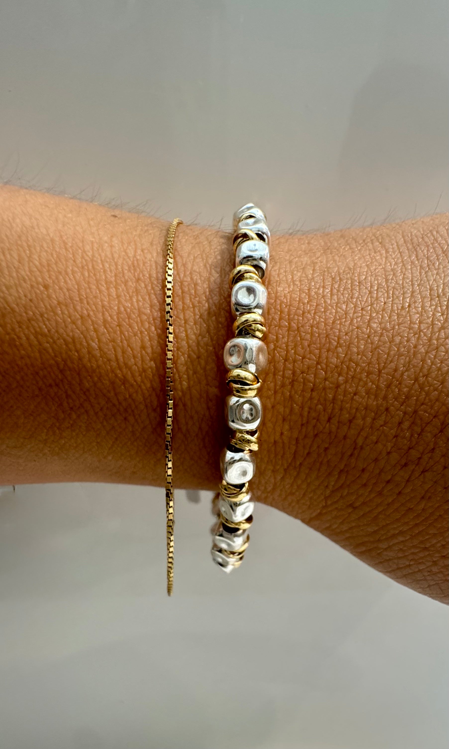 • Design: Il bracciale è caratterizzato dall’alternanza tra pepite lucide rodiate e cerchi intrecciati dorati rosa o giallo. Il loro abbinamento rende il bracciale molto moderno.