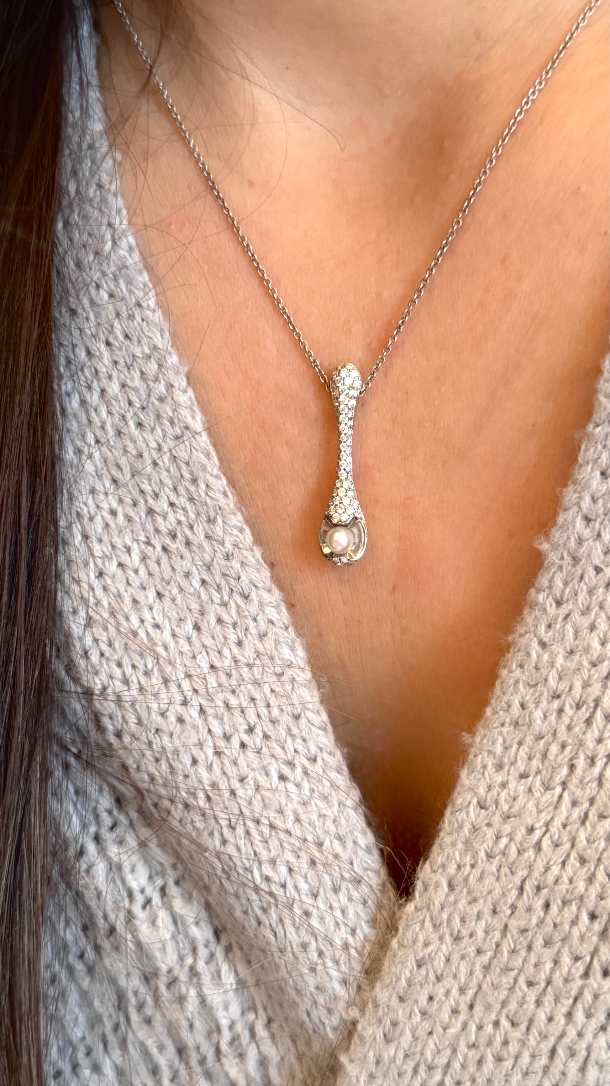 In questo ciondolo un pavè di diamanti e’ il custode di una perla naturale di 3 mm.