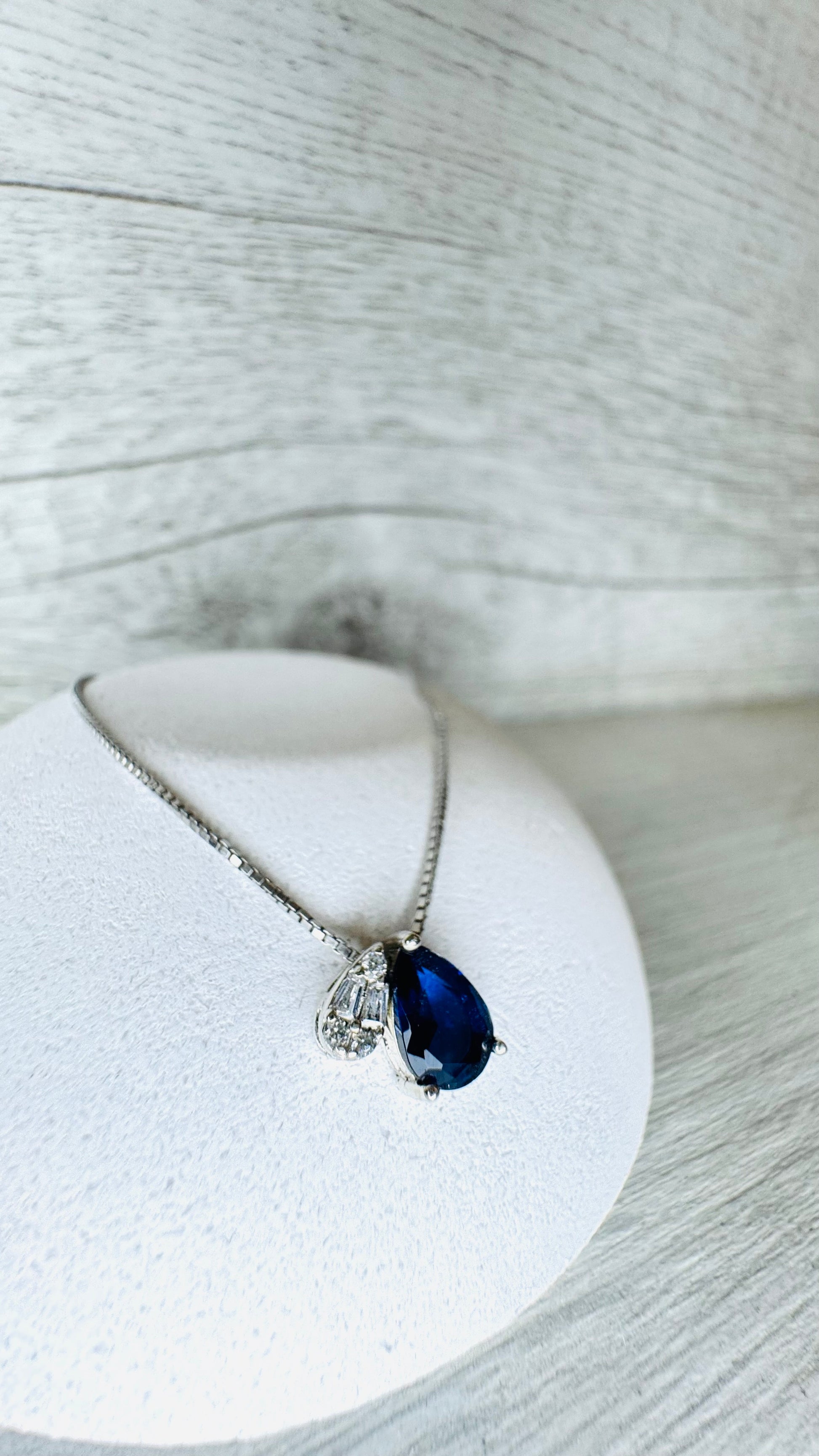 Eleganza e delicatezza si incontrano nella collana Two Drops. Realizzata in argento 925, questa collana è  composta da: una goccia di zirconi bianchi, misti taglio brillante e baguette, e una goccia in zircone blu simil zaffiro.