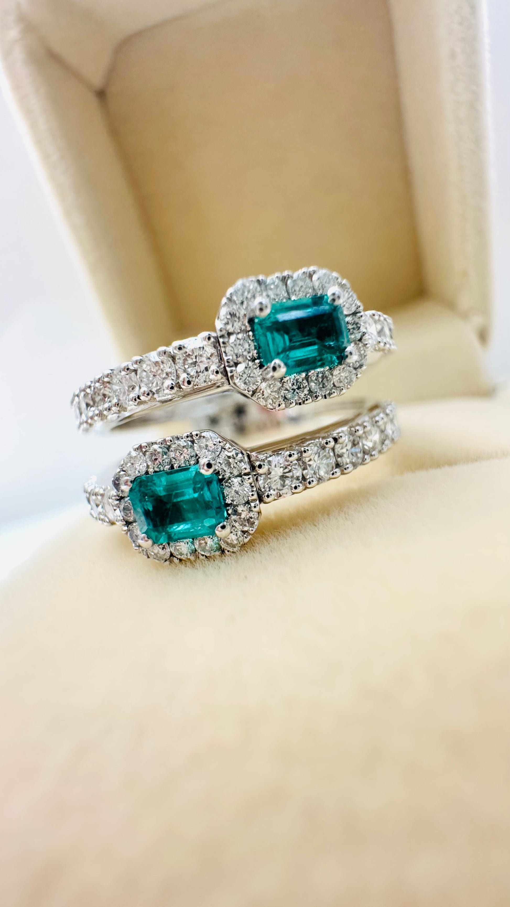 Un gioiello delicato e raffinato, il Double emerald ring in oro bianco 18 carati nasce dall’ unione di due fedine con centrale in smeraldo e laterali di diamanti sfalsate tra loro. Un design semplice ma allo stesso tempo riempitivo che si fa notare per la sua brillantezza.